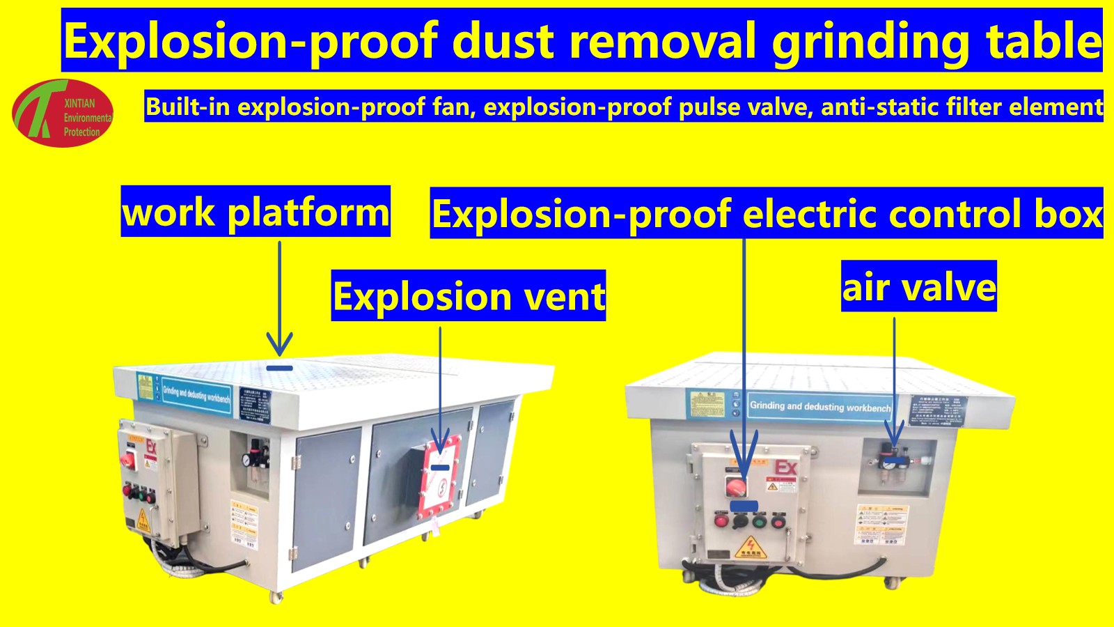 Ved slibning startes blæseren. Under påvirkning af blæseren suges luften nær luftindtaget på bordet og siden af den lodrette plade ind. Den luftholdige støv kommer ind i rammen gennem luftindtaget, og luften absorberes jævnt og opsamles af filterpatronen. Filterpatronen filtrerer støvet i luften, og luften renset ved støvopsamling ledes ud i atmosfæren gennem luftudtaget i bunden af rammen.